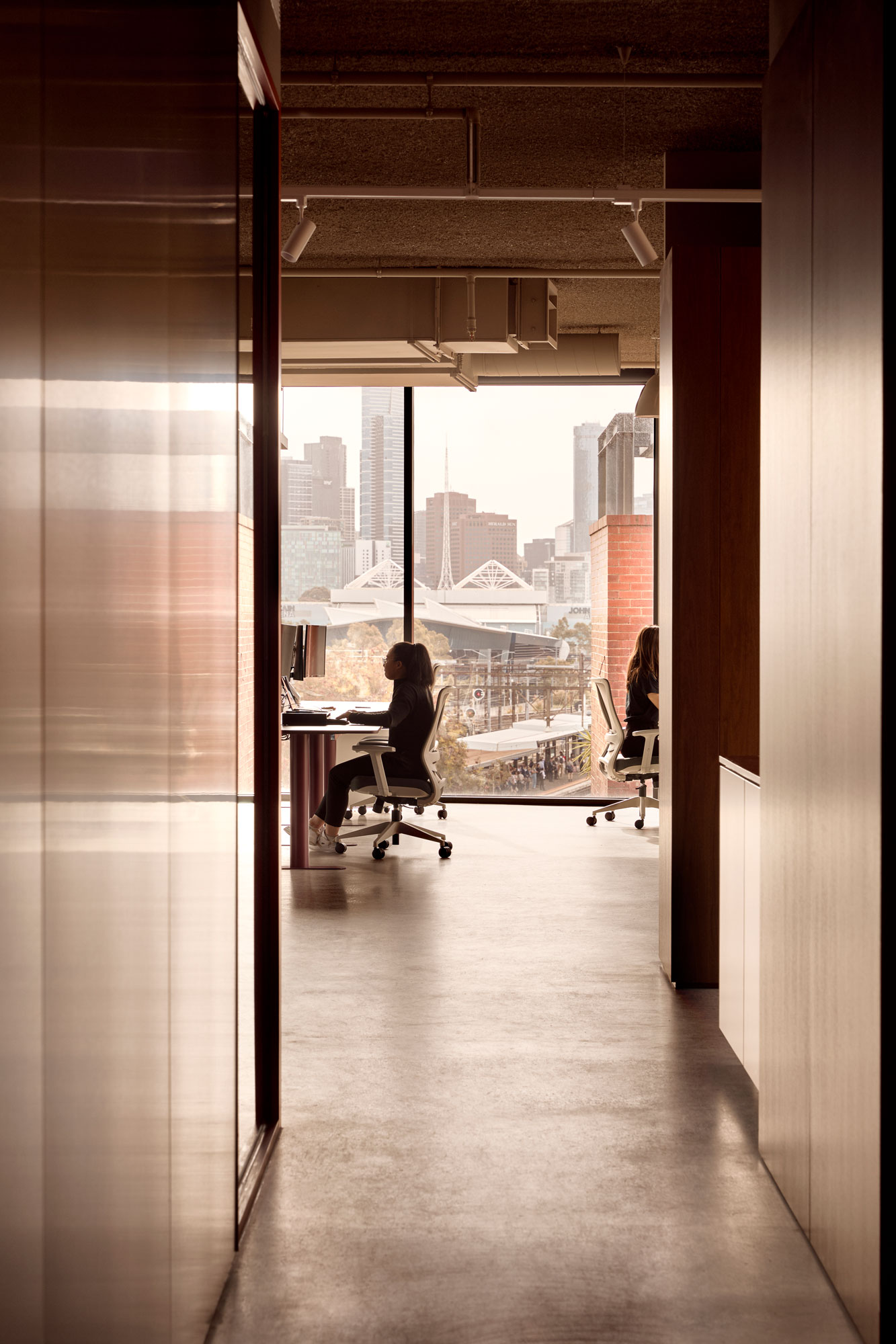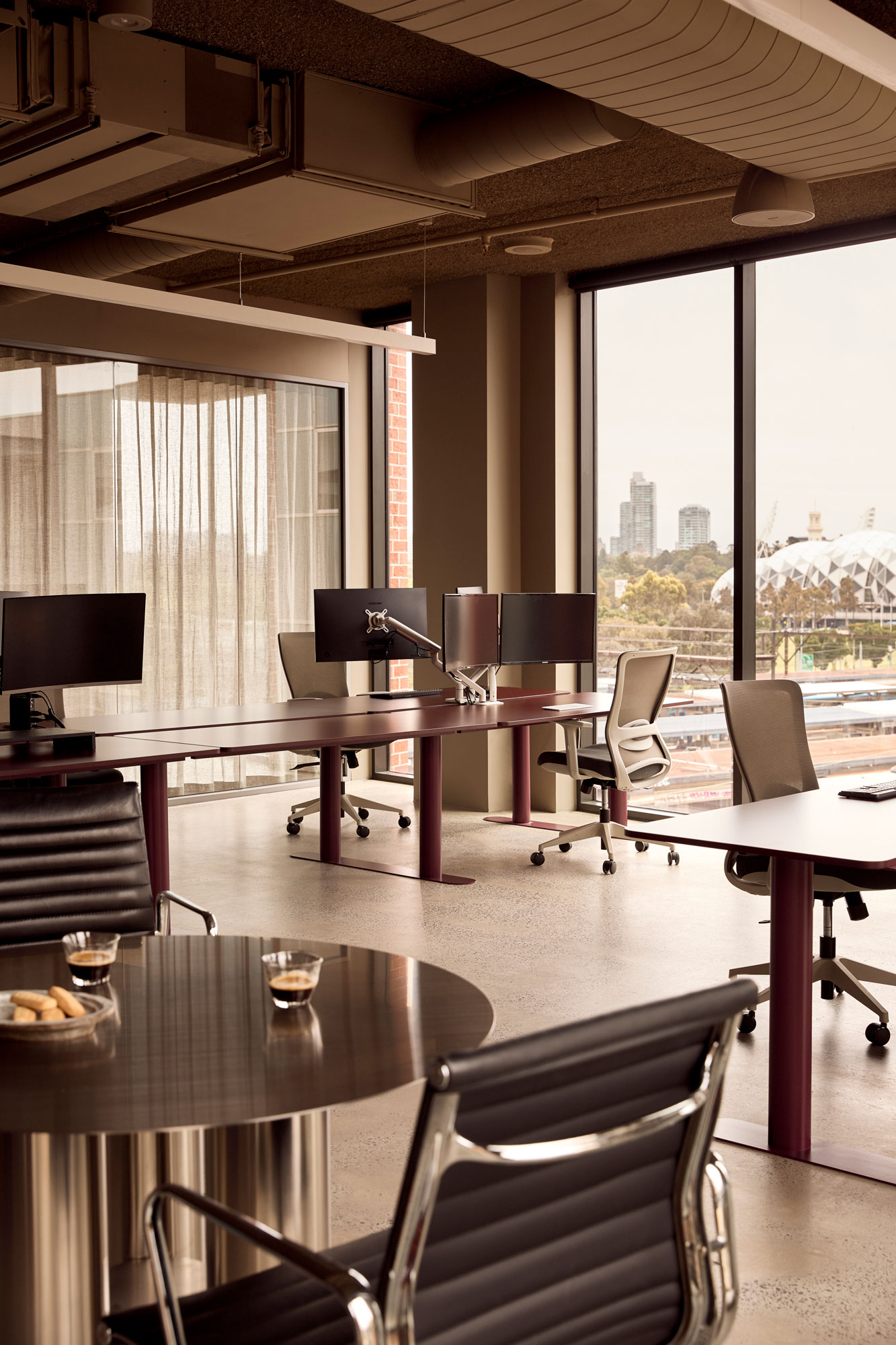 The planning prioritises openness and connection, balancing collaborative zones with spaces for focused work. Generous sightlines and framed views to the city reinforce a sense of expansiveness, while the material palette anchors the experience at a human scale.