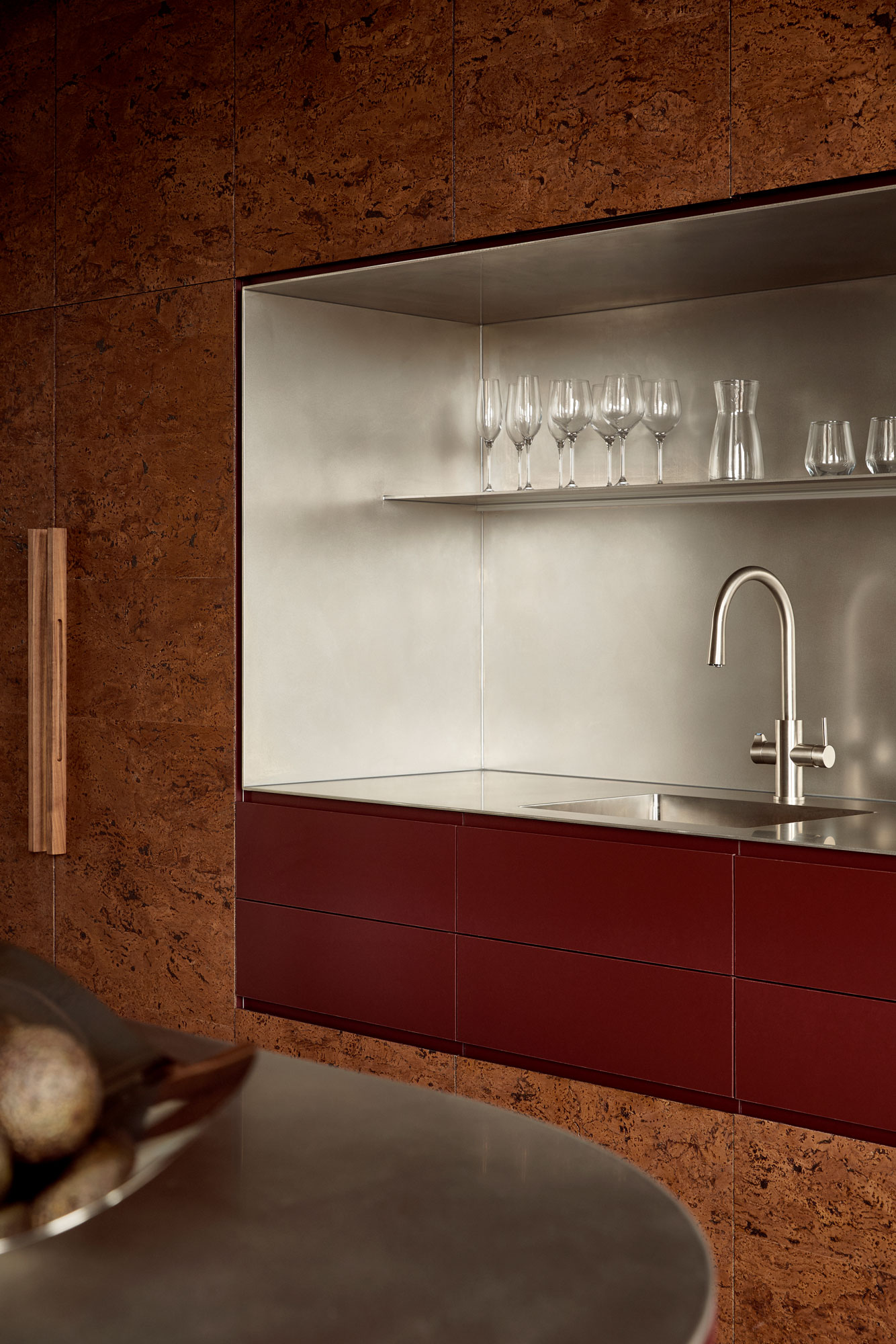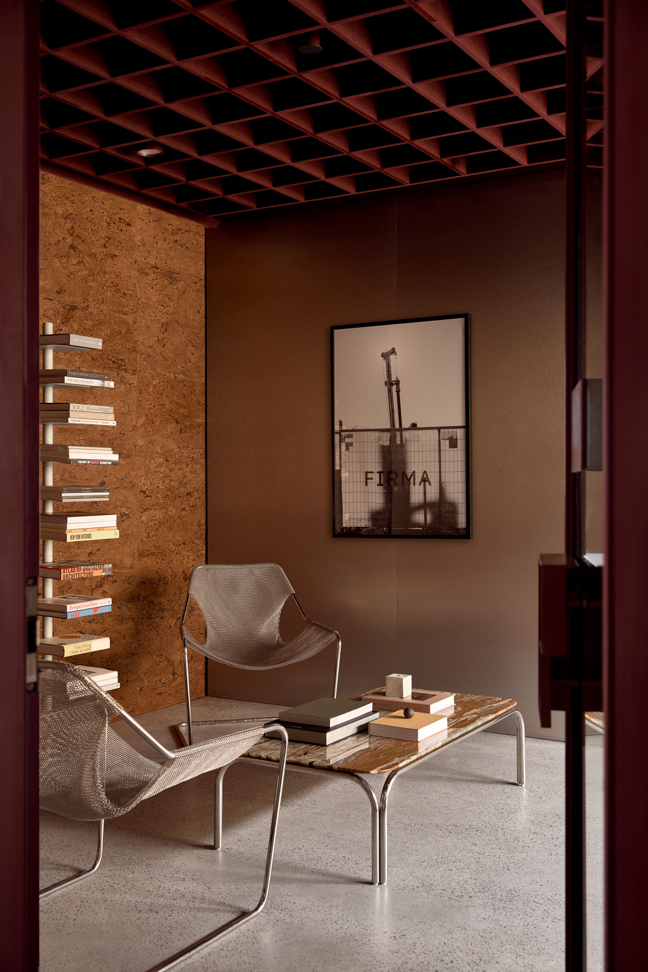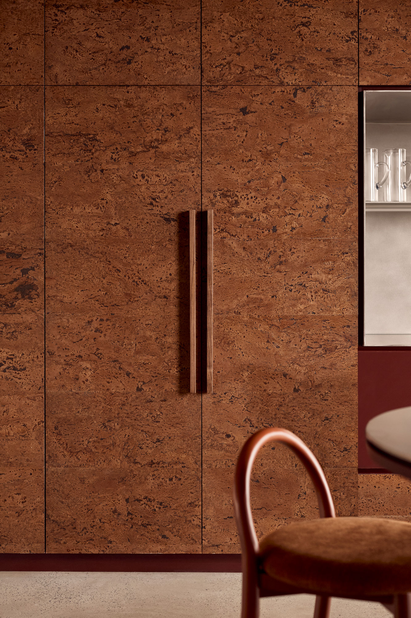At the centre of the project is an unconventional material decision: cork. Typically relegated to pinboards or acoustic backing, here it is elevated and applied with intention. The design leans into its tactility and tonal depth, pairing it with deep burgundy and moody neutrals, offset by precise moments of stainless steel. The result is warm, immersive and quietly luxurious; a deliberate departure from the archetypal industrial office.