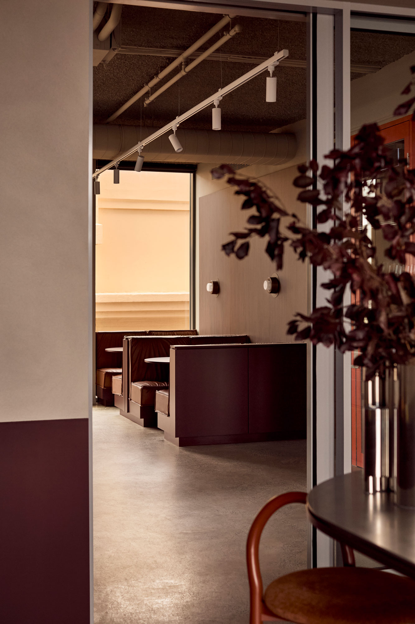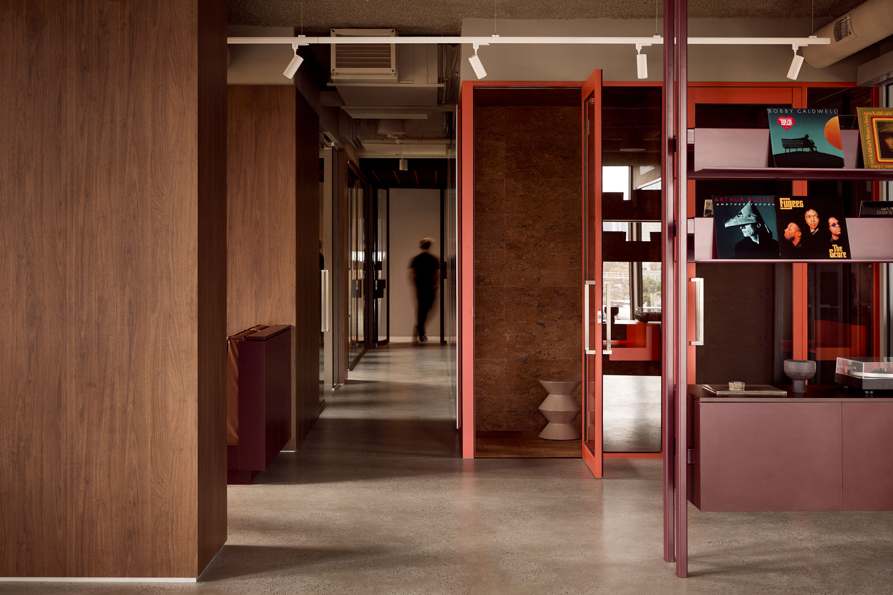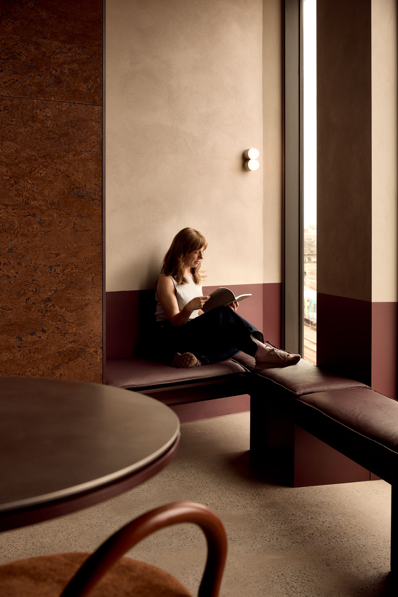At the centre of the project is an unconventional material decision: cork. Typically relegated to pinboards or acoustic backing, here it is elevated and applied with intention. The design leans into its tactility and tonal depth, pairing it with deep burgundy and moody neutrals, offset by precise moments of stainless steel. The result is warm, immersive and quietly luxurious; a deliberate departure from the archetypal industrial office.