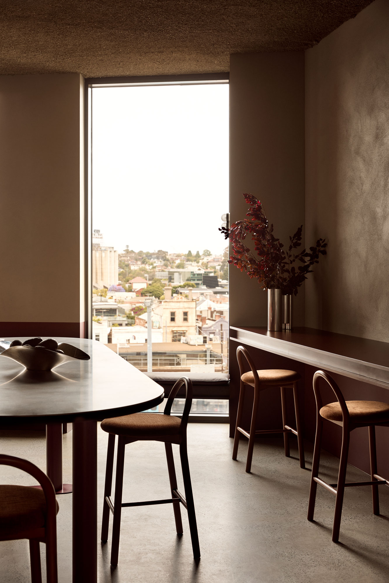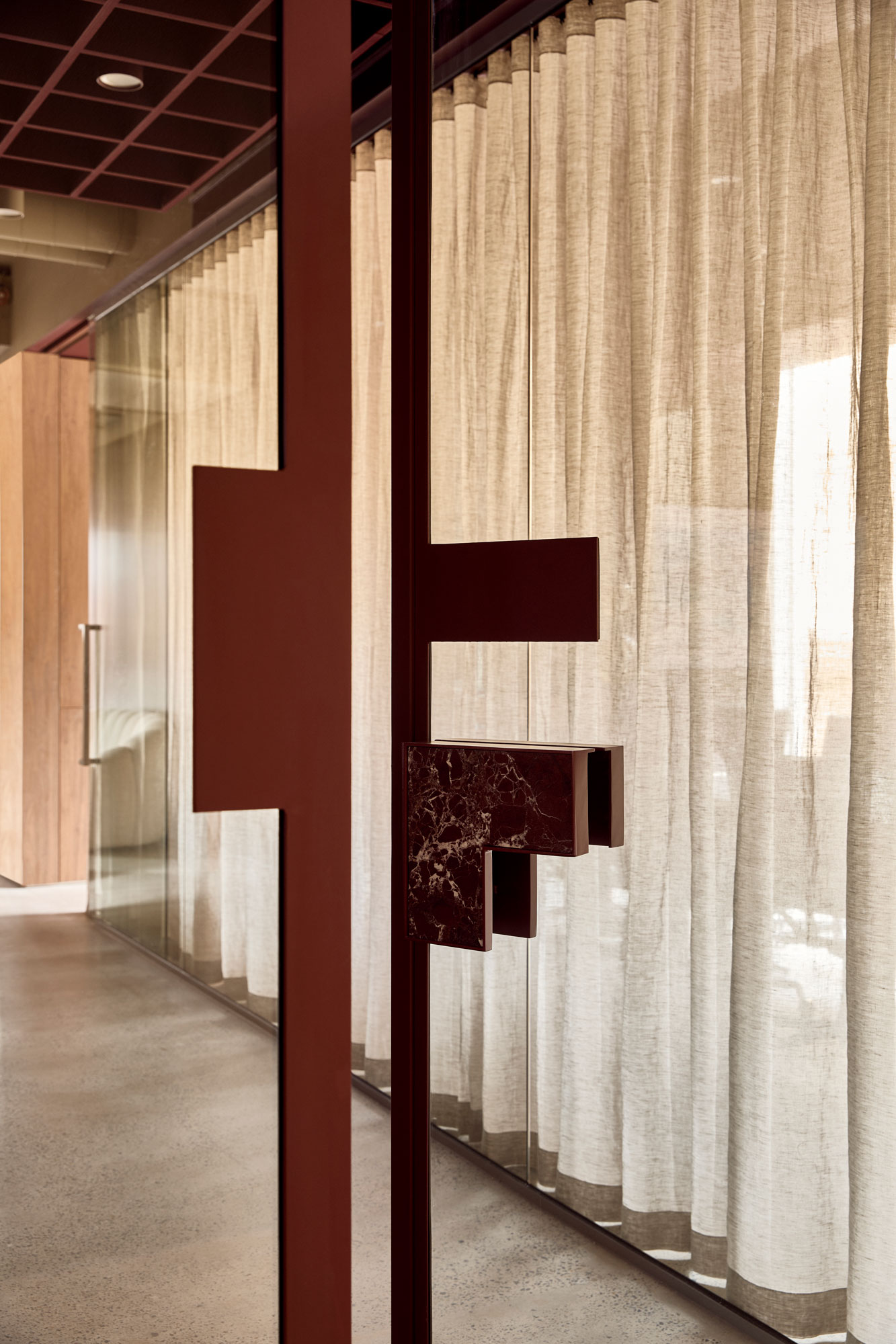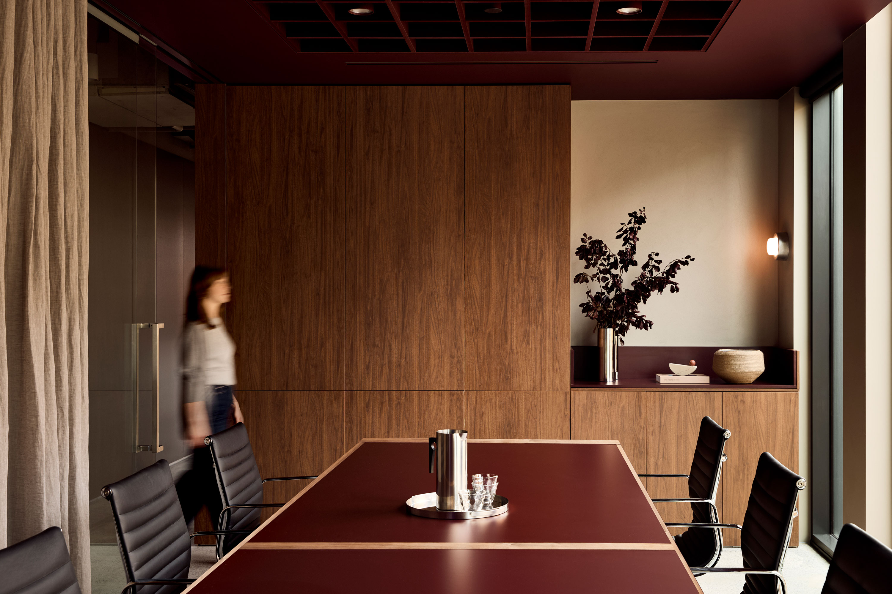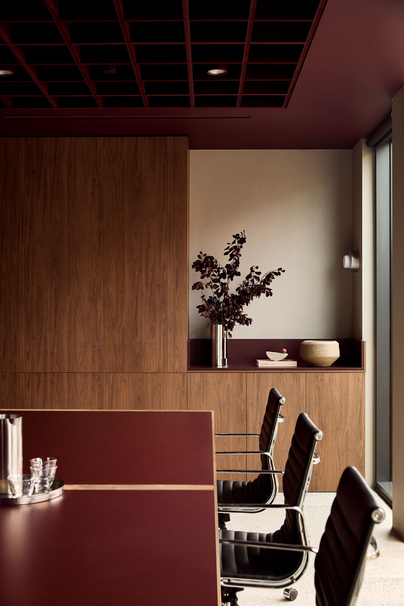The palette is deliberately controlled: warm neutrals sit alongside cool steel, walnut joinery and deep burgundy accents. Light becomes a material in its own right — softening the composition without diluting its strength.