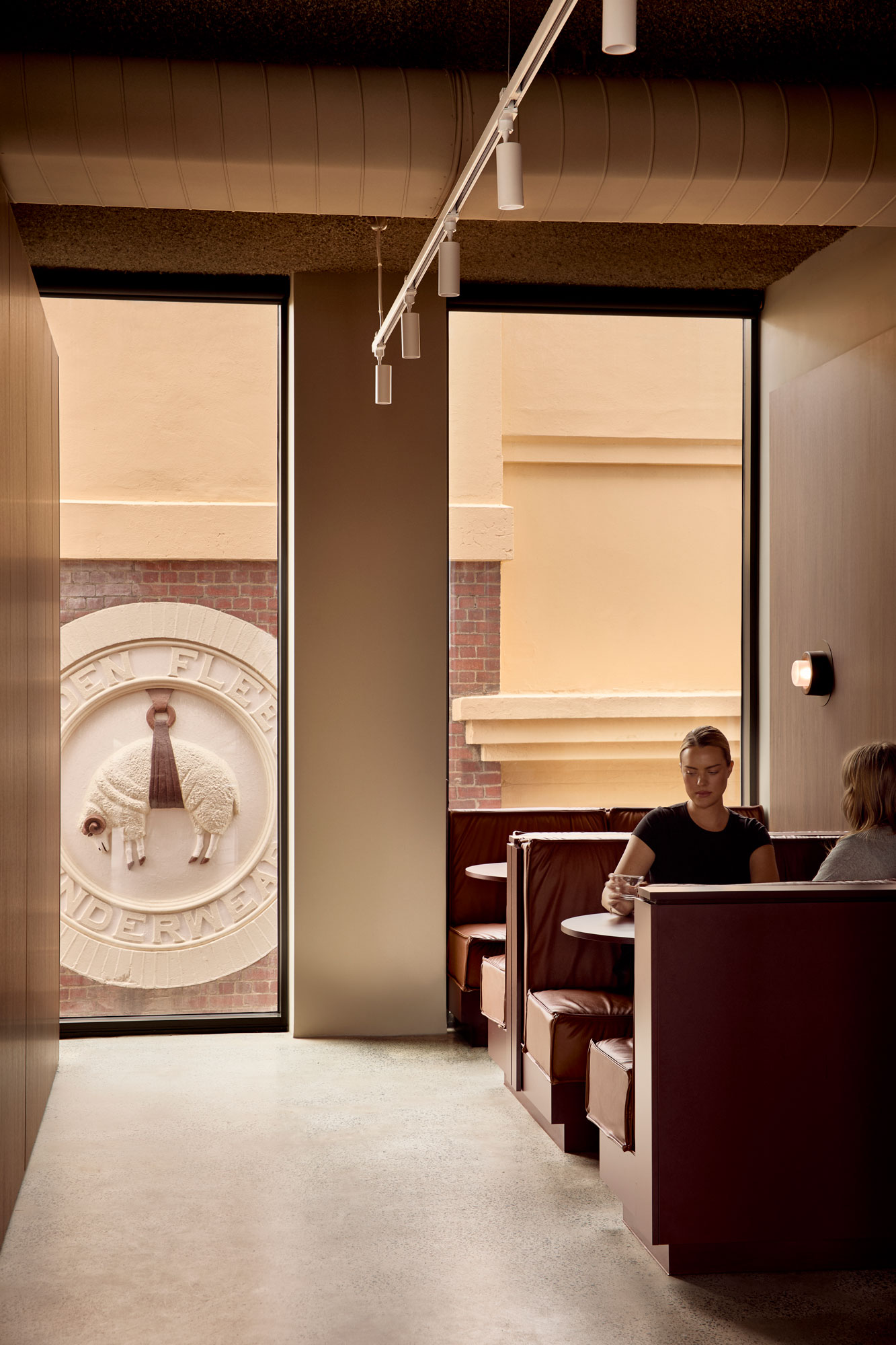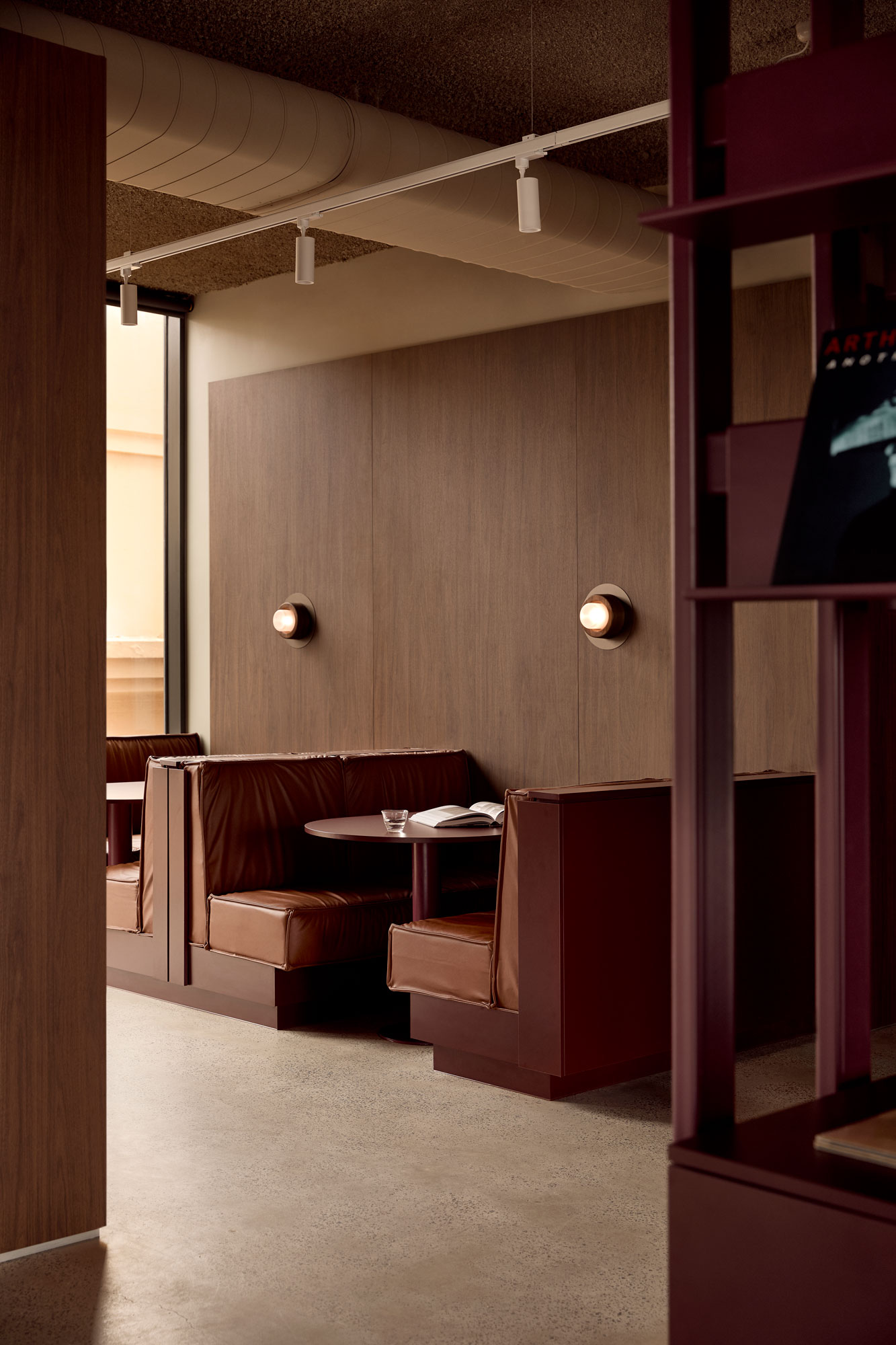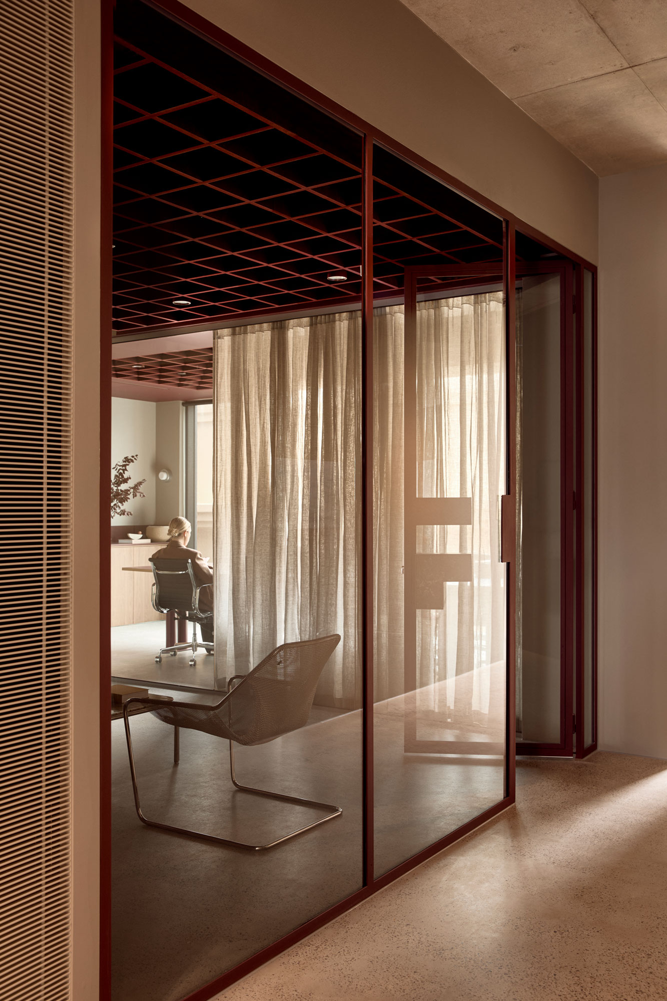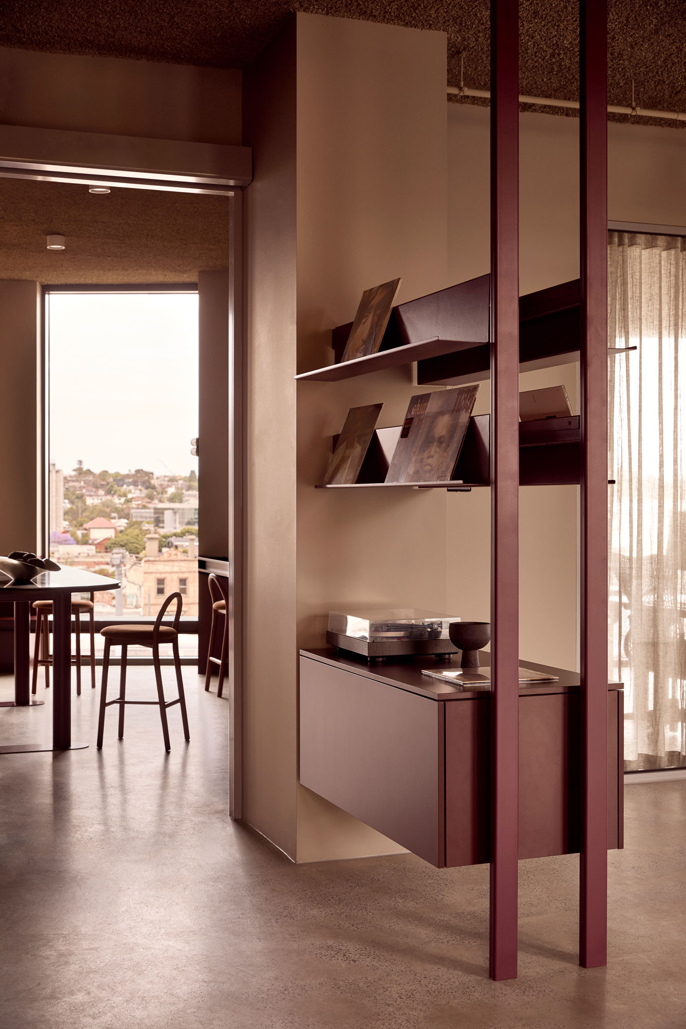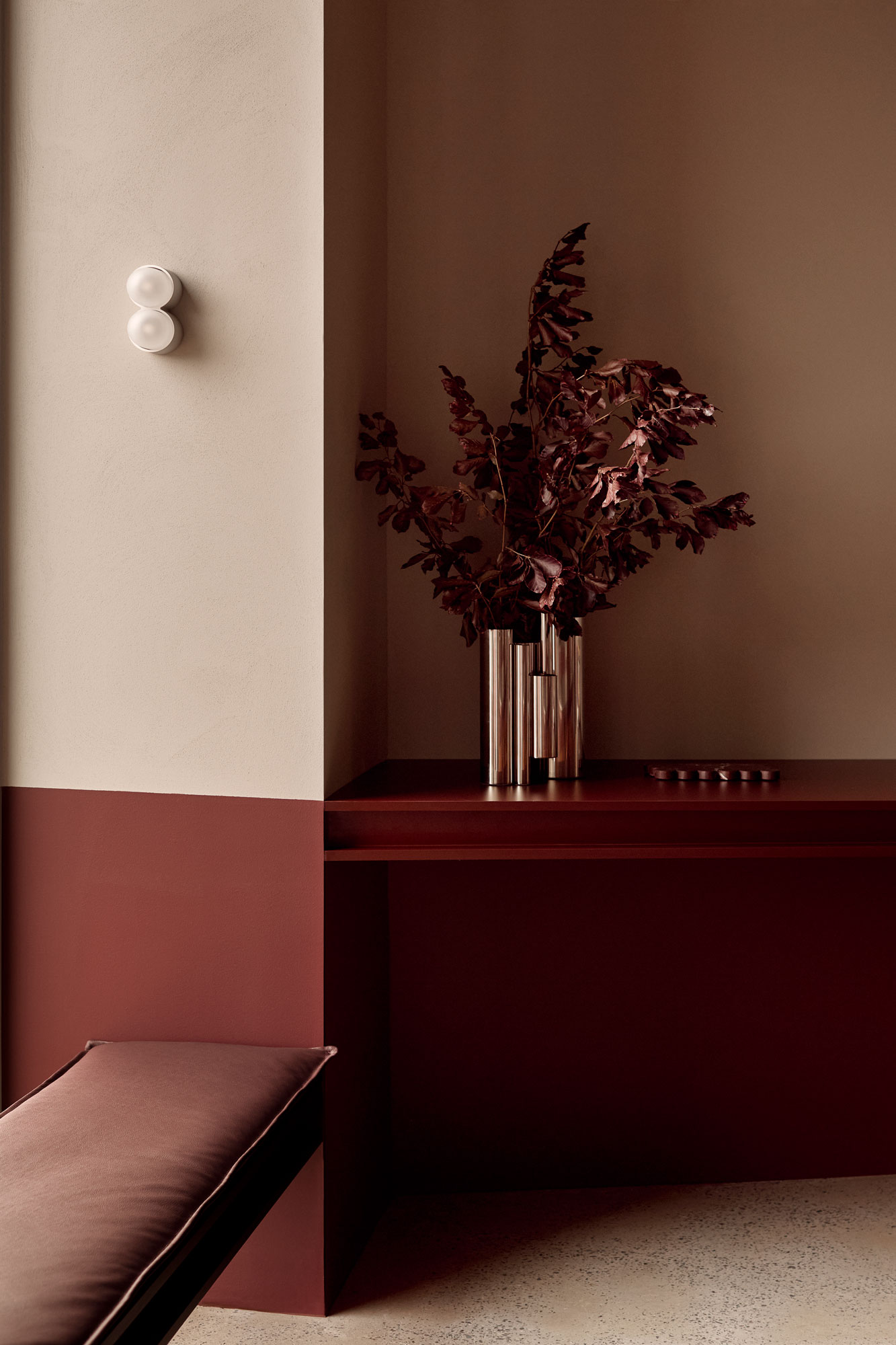 The palette is deliberately controlled: warm neutrals sit alongside cool steel, walnut joinery and deep burgundy accents. Light becomes a material in its own right — softening the composition without diluting its strength.