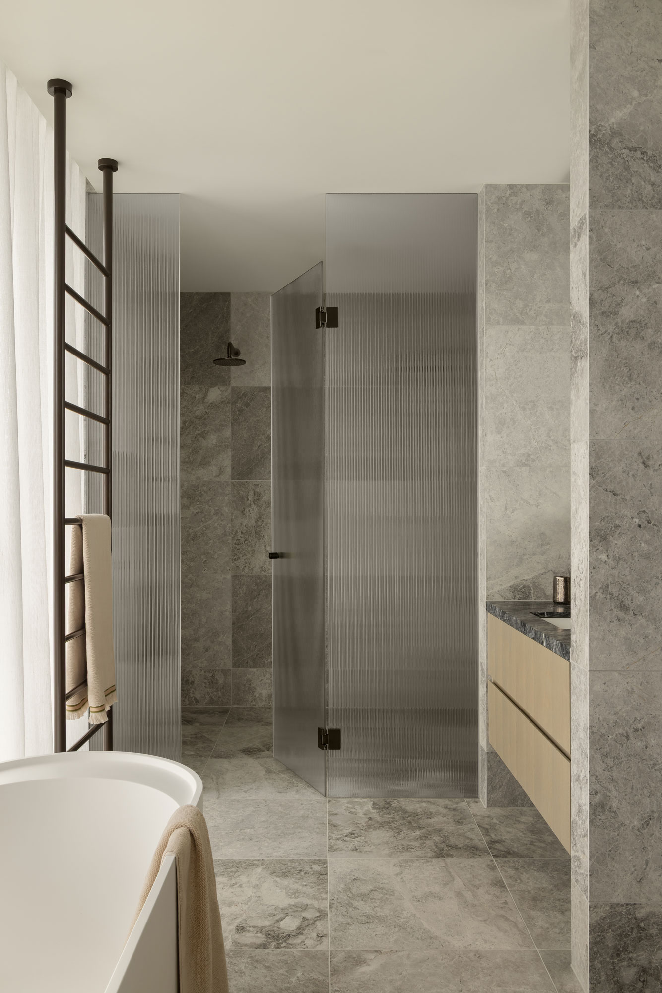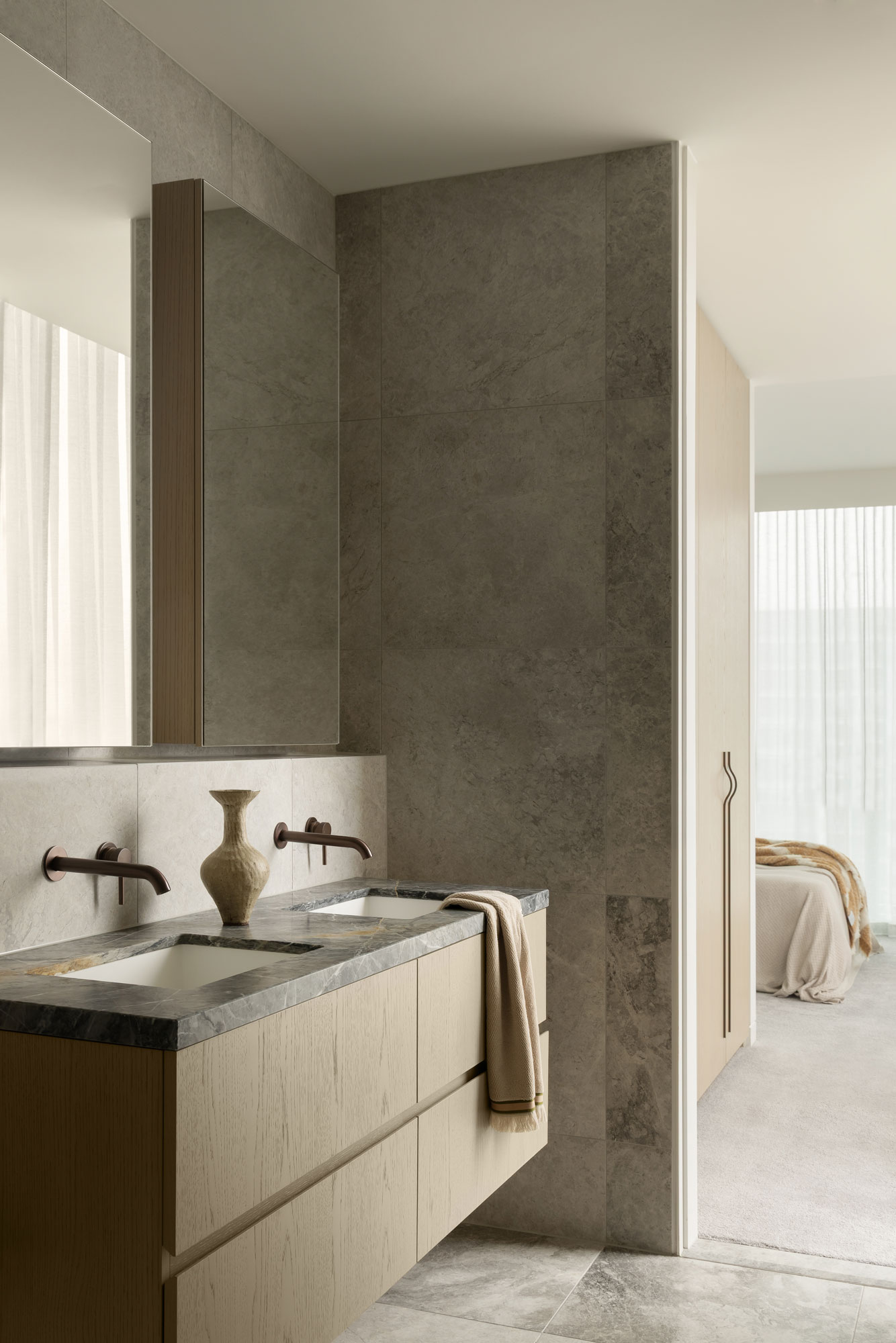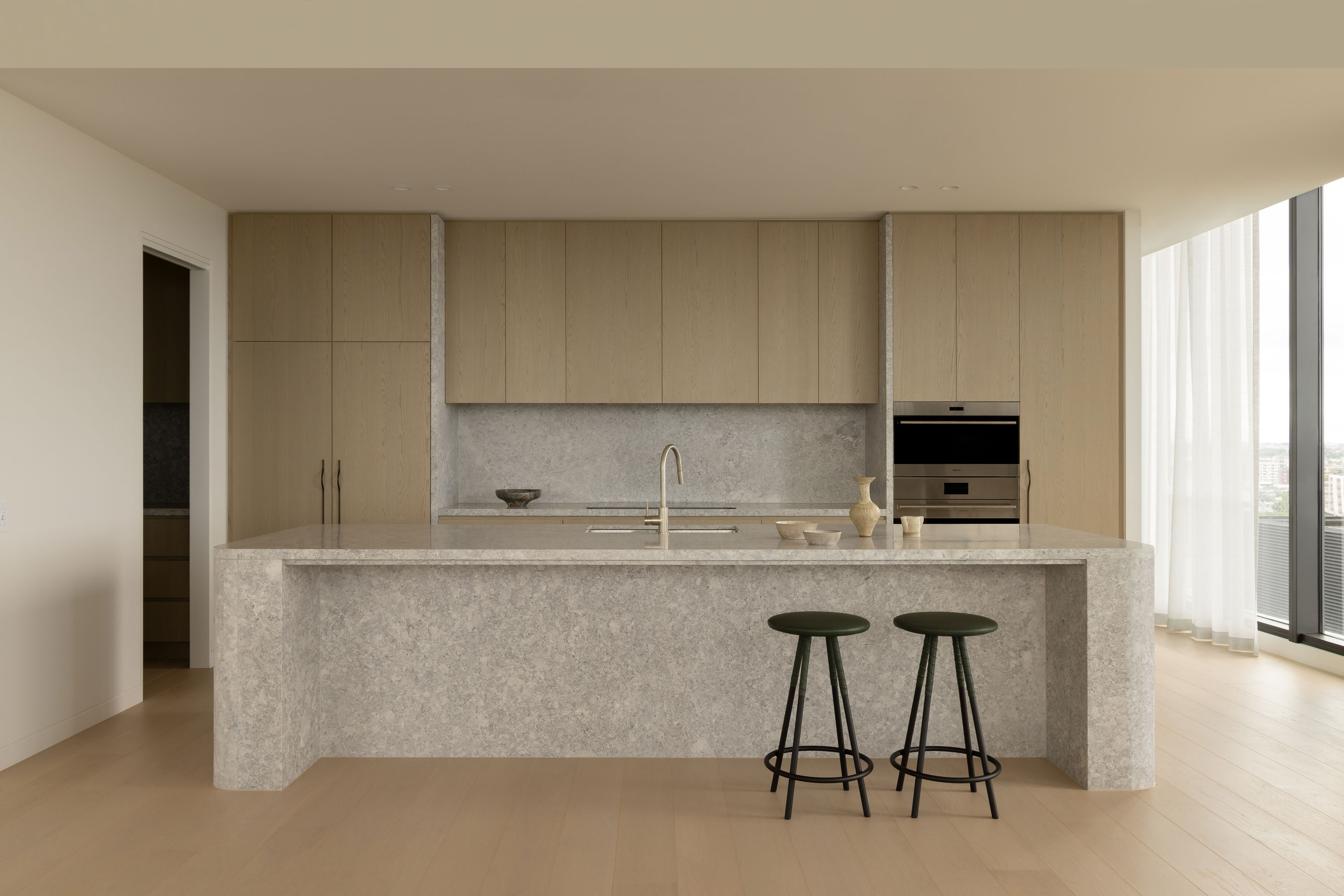 At the street level, the brick façades of the adjoining heritage properties and the art deco style of others in the area are the catalysts for the podium treatment. Featuring an arched portal that frames the double height foyer, the intricate brick detailing of the podium connects the ground floor with the streetscape, cultivating a continuous arrival experience.