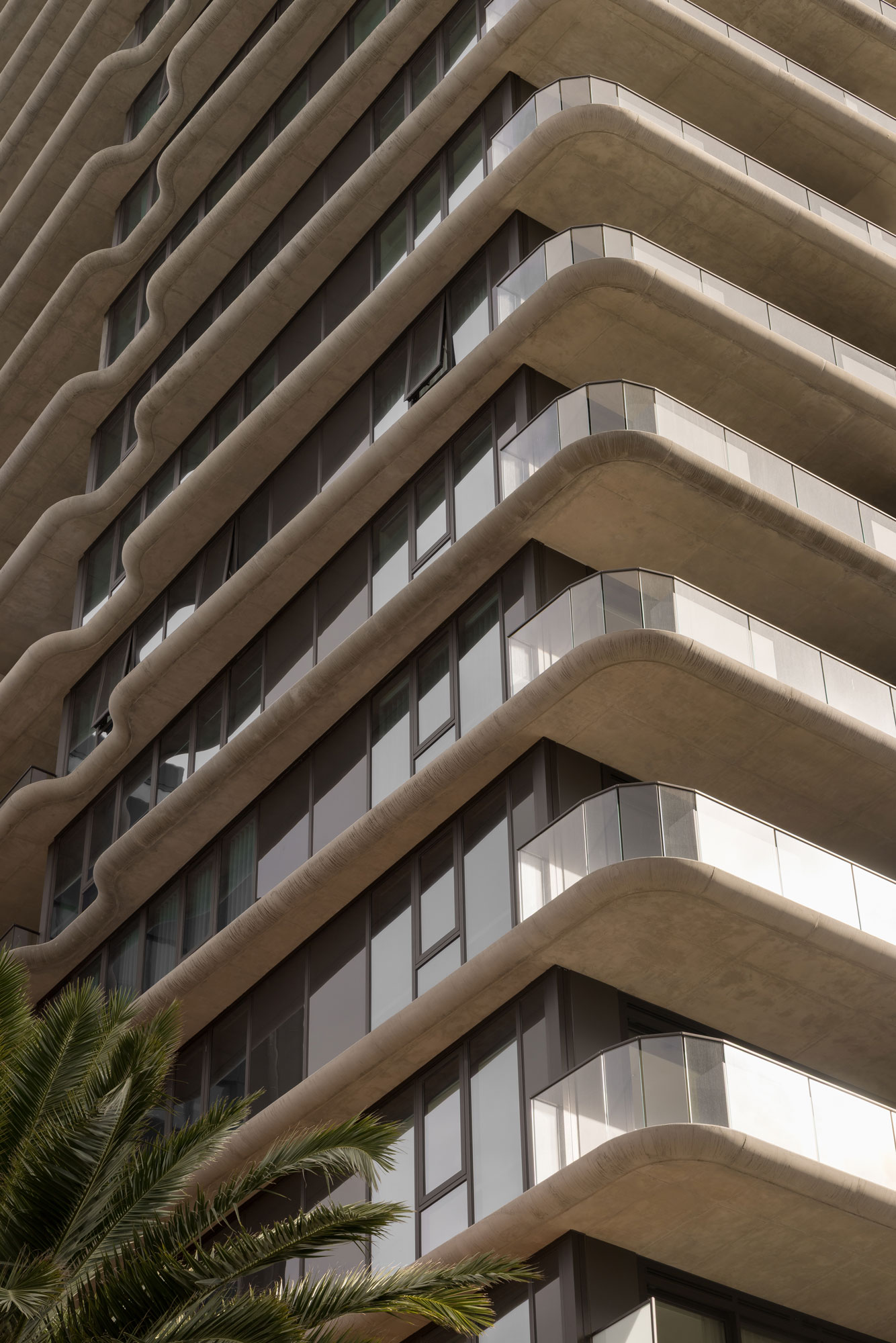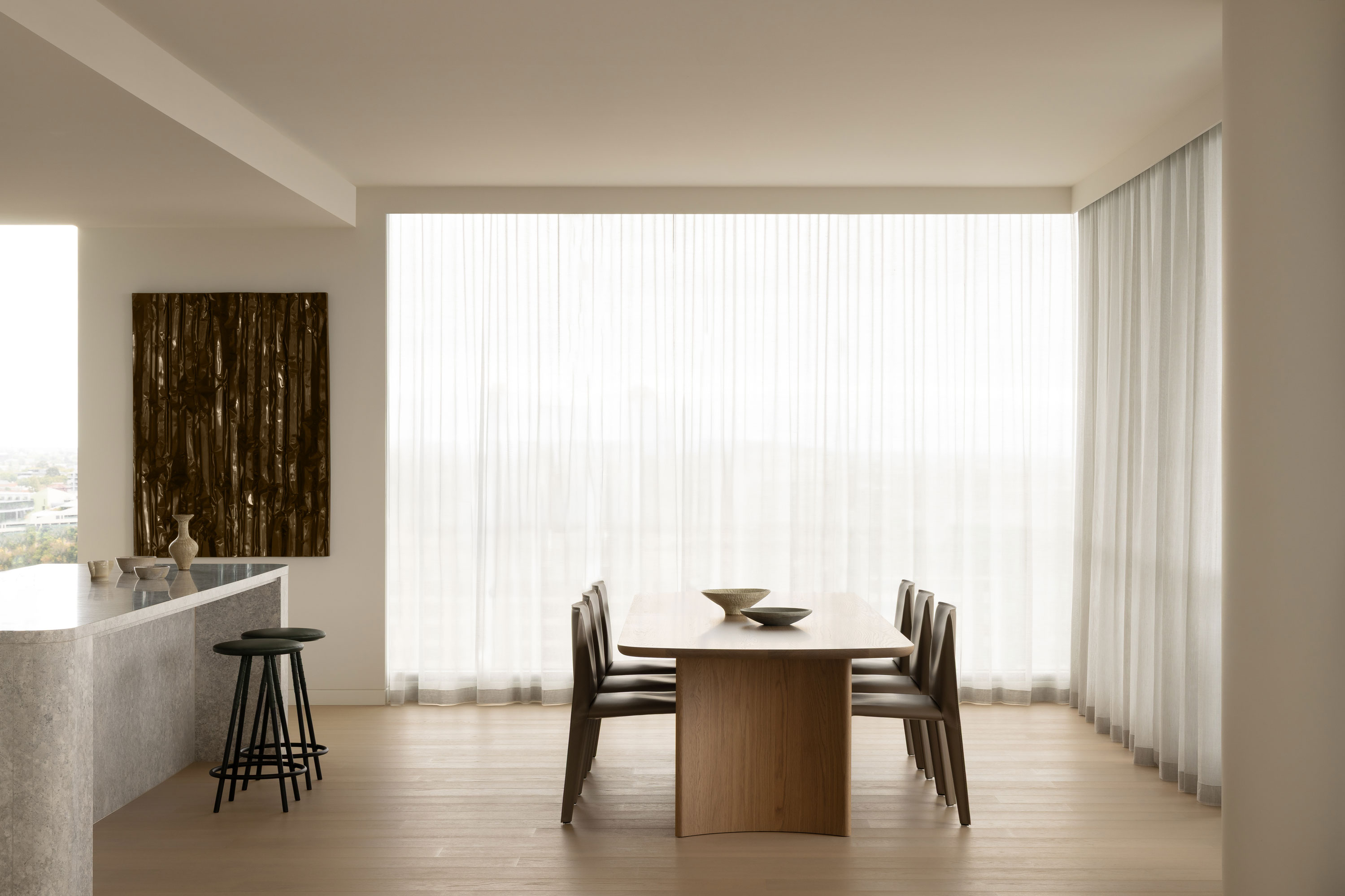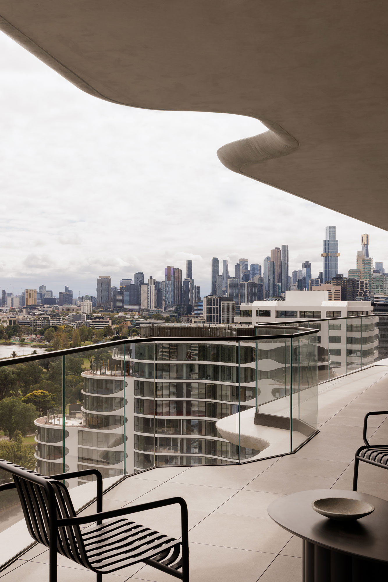 Projecting eaves fan out above the podium as the tower ascends, creating a flowering effect. Drawing inspiration from the local Albert Park Sailing Club, the architecture elegantly mimics the curvaceous monocoque frame of a yacht hull.